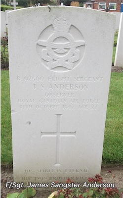Fl/Sgt. James Sangster Anderson. Fulford Cemetery- Sec. 2. Row F. Grave 6. Son of William Boyd and Dagnie Anderson, of Craigmyle, Alberta, Canada. Headstone Inscription: “His spirit is eternal. His twin brother Billy Was lost 20th January 1943 H.W.E.” (Headstone shown left)